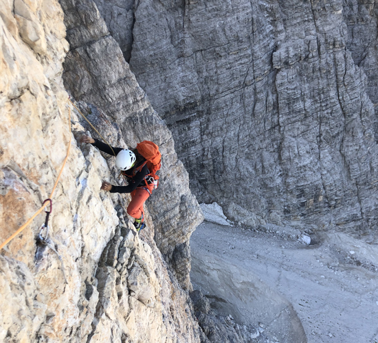 Die Innerkofler-Führe ist die leichteste aller Nordwandroute mit traditioneller Absicherung. Der legendäre Sepp Innerkofler eröffnete seiner Zeit mit dieser Begehung eine neue Ära in der Klettergeschichte. Bereits beim Zustieg über das ausgesetzte Band ist ein Hauch von Nostalgie zu spüren.