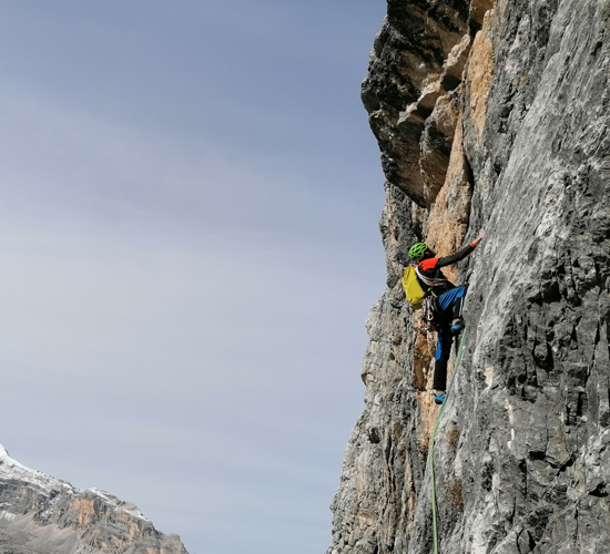 Die Dimai-Führe in der sonnigen Südwand der Punta Fiames, ist ein abwechslungsreicher Klassiker im mittelschweren Fels, der aber aufgrund seiner Länge trotzdem nicht zu unterschätzen ist. Aufgrund ihrer Ausrichtung kann sie meist schon früh oder noch spät im Jahr geklettert werden.
